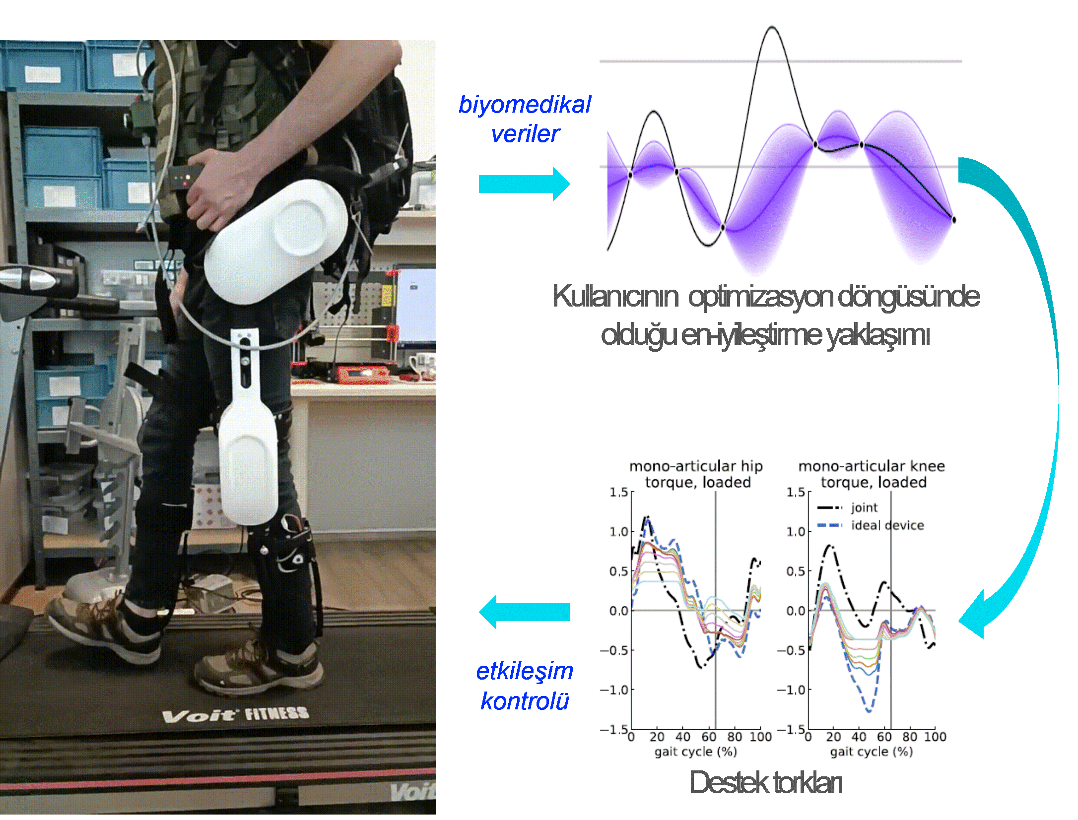Projenin dördüncü hedefi, çok-kriterli optimizasyon yaklaşımı ile kullanıcıların performansını artırmak amacıyla AssistOn-Walk için hesaplanan en-iyileştirilmiş destek torklarının kullanıcının güvenliğini garanti ederek uygulanmasını sağlayacak kuvvet geri-beslemeli etkileşim kontrol algoritmalarının geliştirilmesidir.